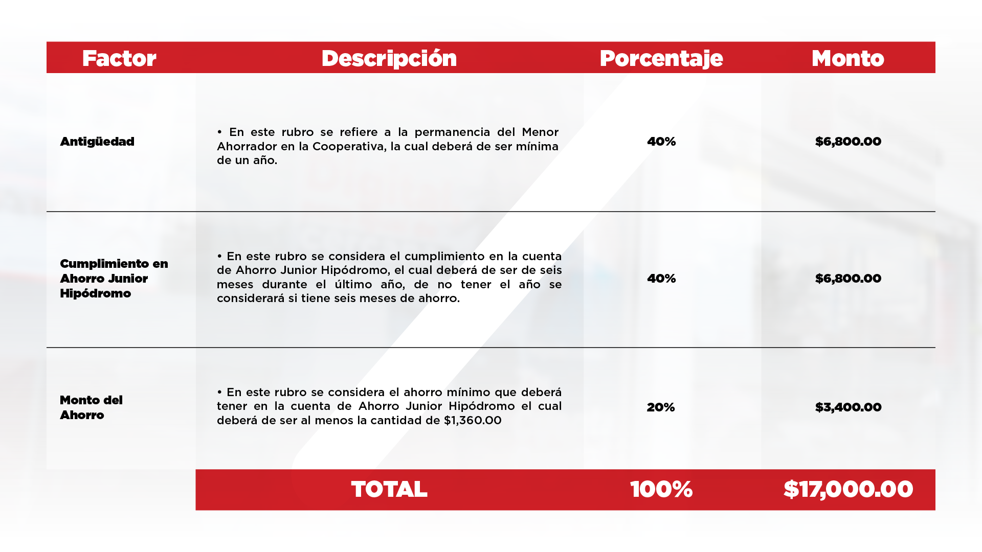 Para el otorgamiento de dicho apoyo se tomarán en cuenta 3 factores, a cada uno de estos se les asigna un porcentaje, el cual en suma nos dará el 100% referente a los $17,000.00 del monto del apoyo.